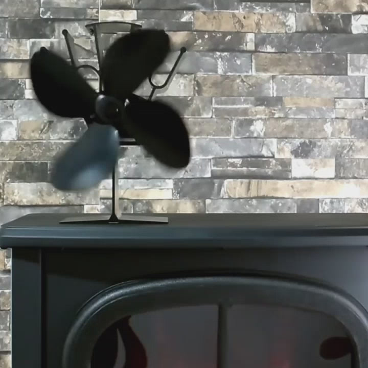 A heat-powered stove fan uses a thermoelectric module (a Peltier/Seebeck cell) sandwiched between a hot aluminum base and a cooler top. As soon as the stove surface reaches about 50 °C (122 °F), the temperature difference generates a small electric current that drives a low-voltage motor and spins the blades. The whole system is fully self-powered — no batteries, no plugs, no wiring. The hotter the stove, the faster the blades turn, so the fan automatically adapts to how much heat you have to circulate. When the fire dies down, it slows to a stop on its own. Read the full science explained →